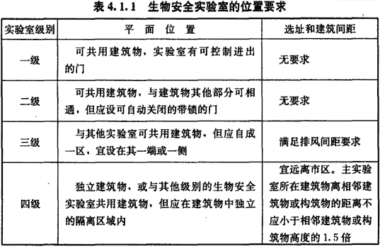 4.1.1 生物安全實驗室的位置要求應符合表4.1.1的規定。